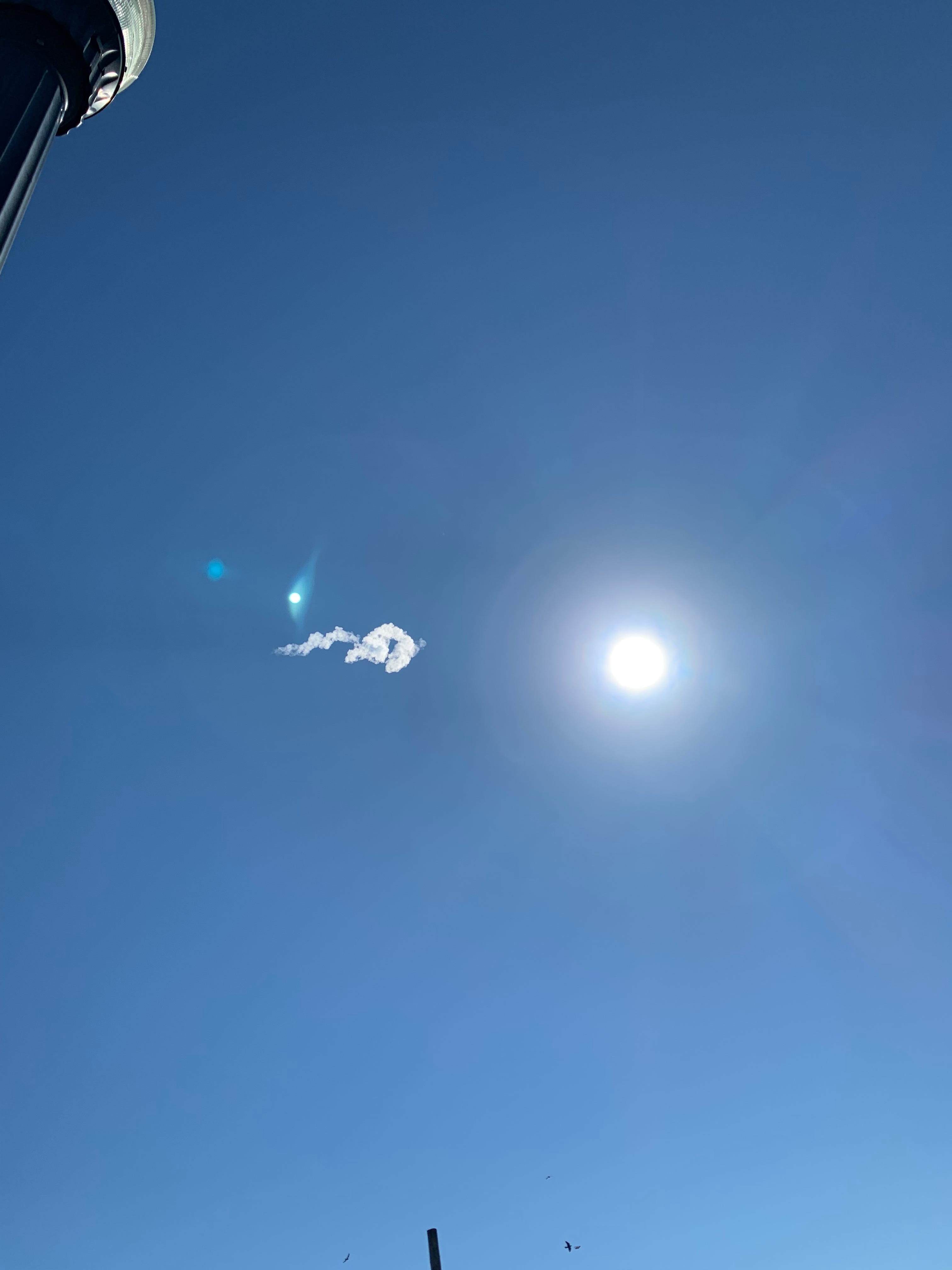 Our suspense ends as we see the rocket rise up over the hotels that line the boardwalk. We’re caught off guard by its sudden appearance; it’s silent at first, but then we hear a slow, low rumble akin to distant thunder – not the gut-shaking, bone-rattling, brain-melting noise evocatively described by those who have witnessed Saturn V or space shuttle launches up close. Antares arcs across the sky, a bright orange fireball glowing from its twin first-stage engines as it passes through the blinding light of a brilliant white sun. The rocket leaves behind just a small straggle of white vapor in the cobalt firmament as swiftly it makes its way to the International Space Station, a dwindling yellow star in the daytime heavens that soon disappears beyond our perception.